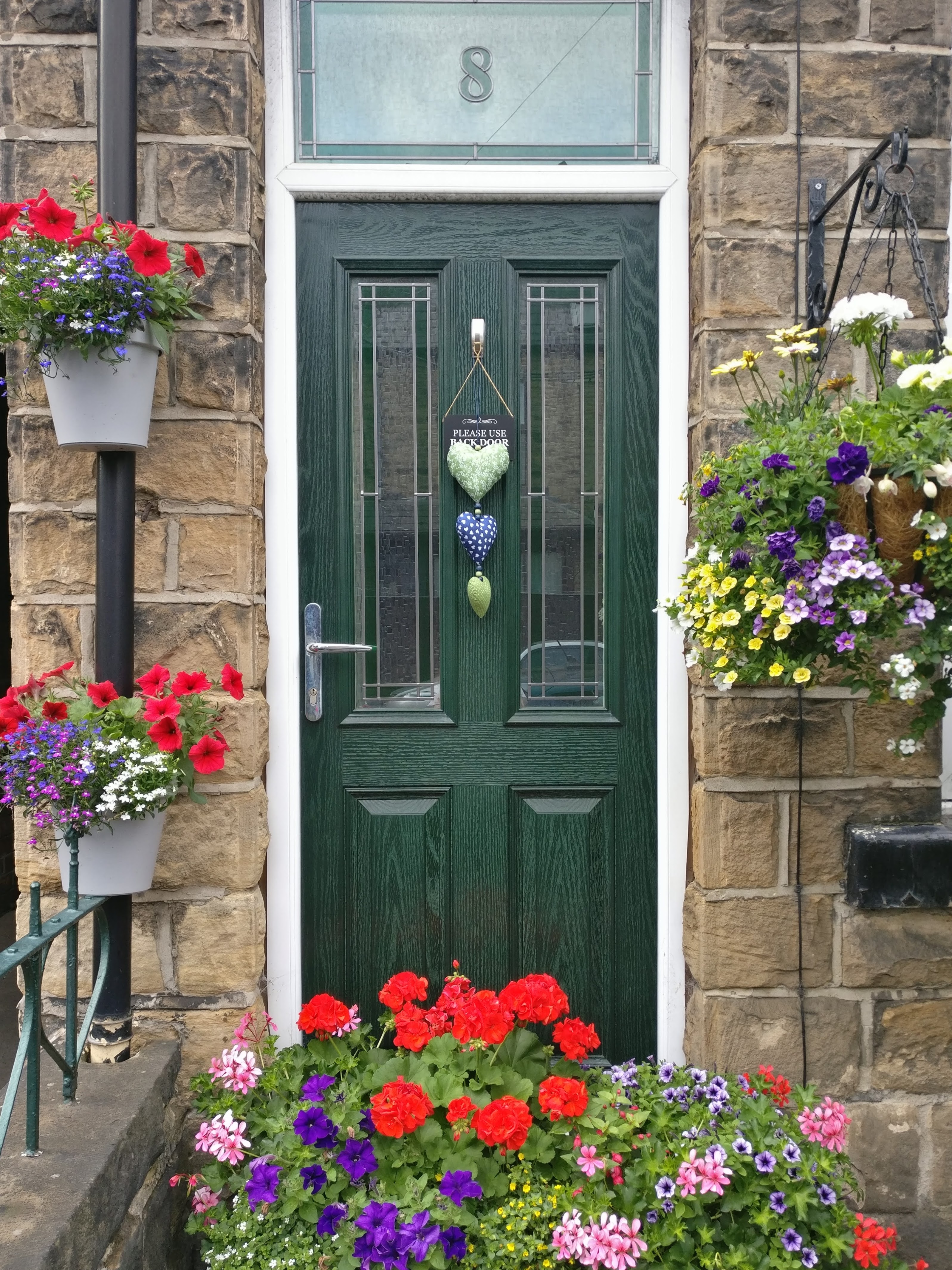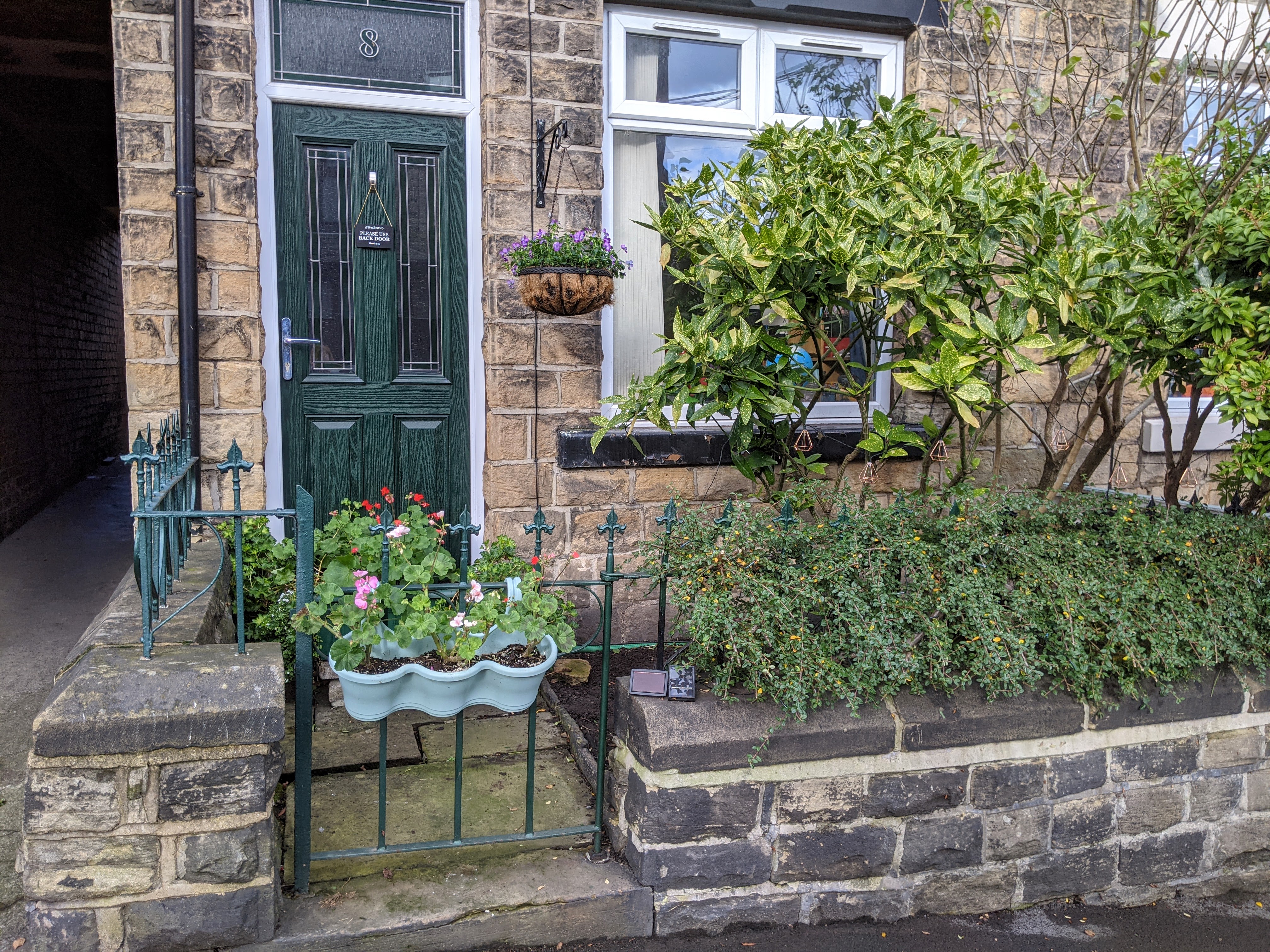 To the front of the property is a paved path to entrance door, flower-bed containing mature plants and shrubs and low stone wall topped with metal railings to three sides. Entrance to lounge through the PVC door with double glazed panel and framed window.