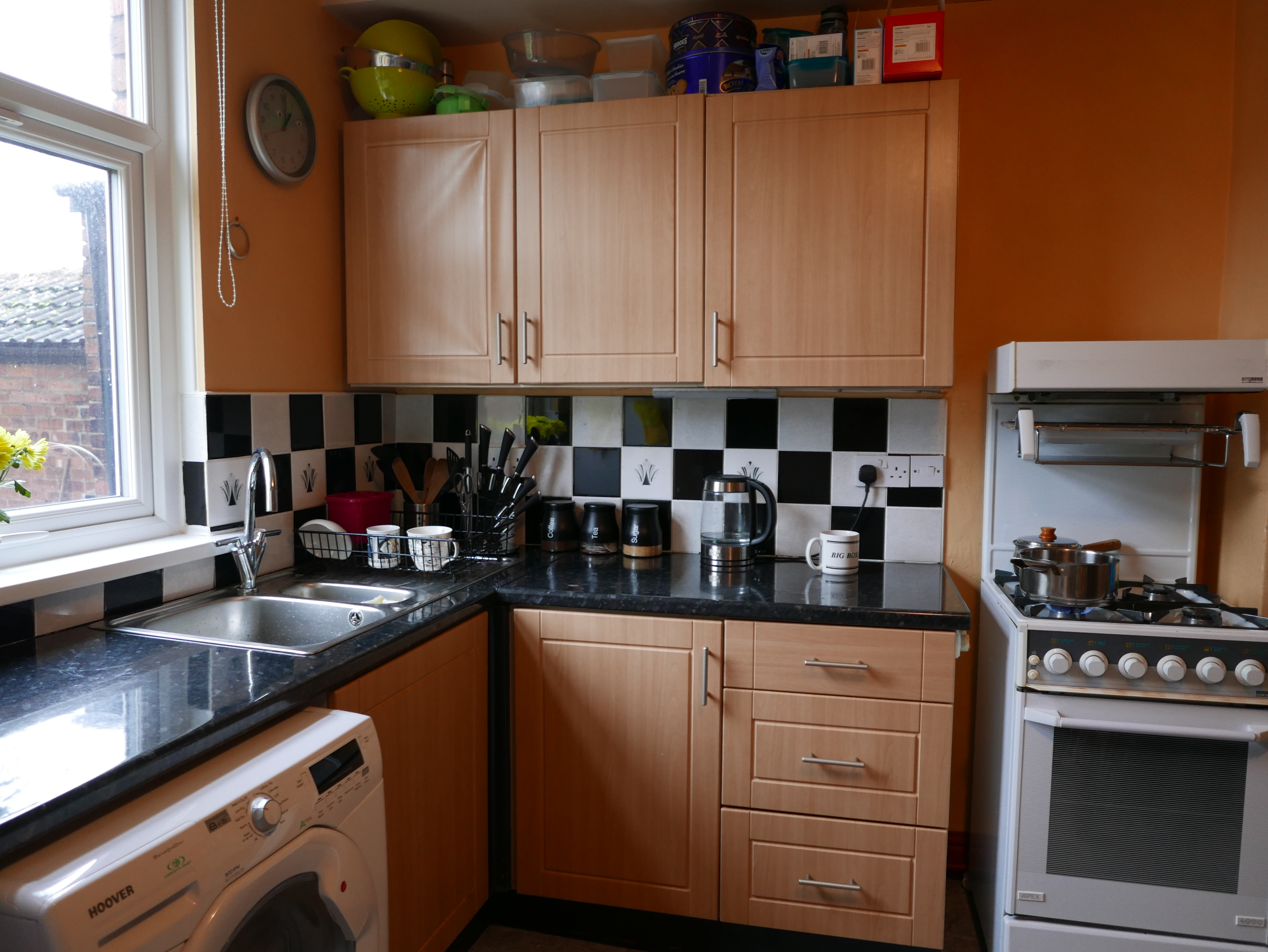 Kitchen/Diner (3.58m x 3.63m) Rear facing wooden entrance door with single glazed panel , rear facing PVC framed double glazed window, heating boiler, radiator, built-in storage cupboards, range of wall and base units, tiled splashbacks, inset stainless steel sink, space and plumbing for a washing machine and space and connection for a gas cooker. The floor has been recently tiled. Door to Cellar.