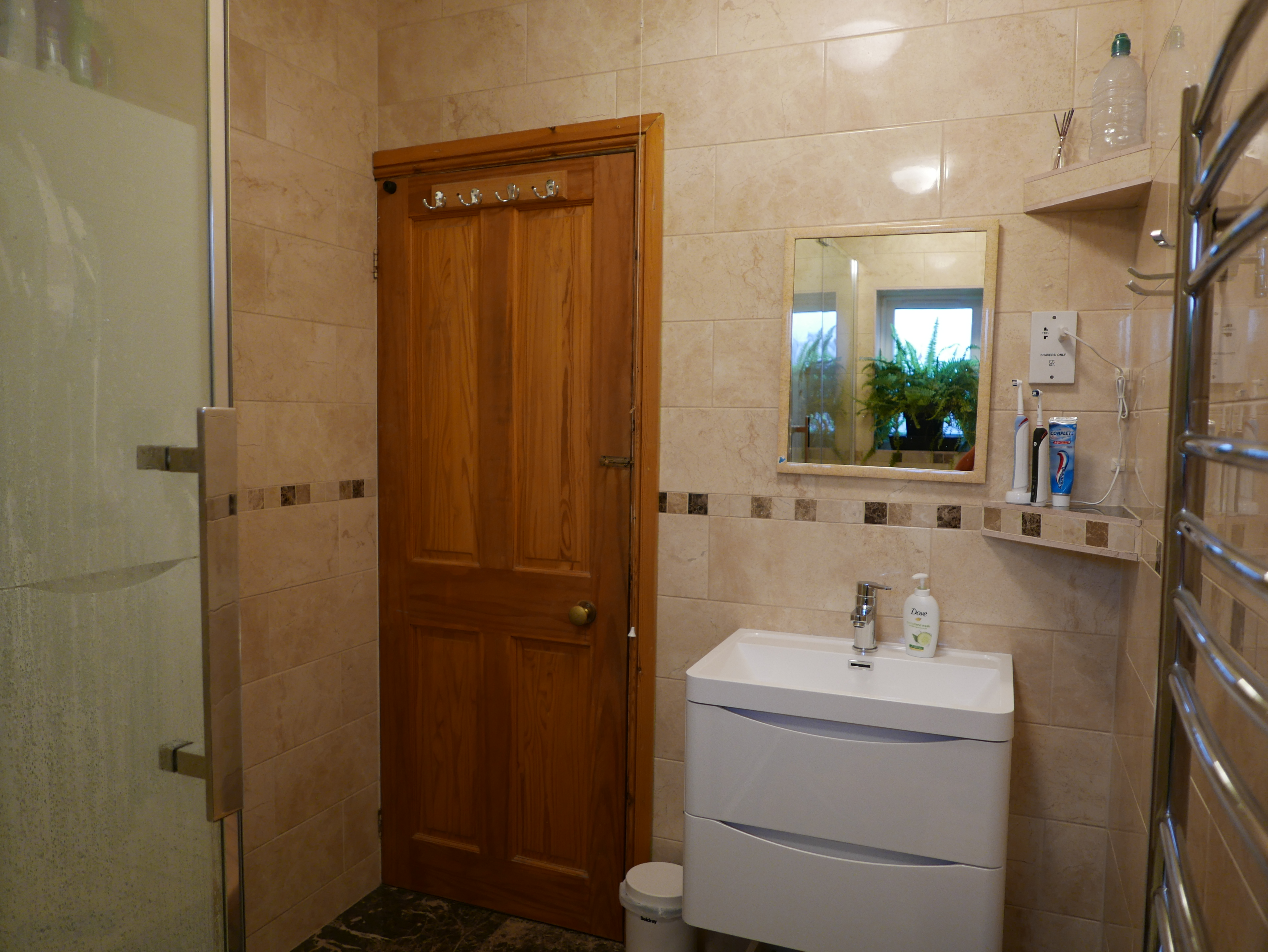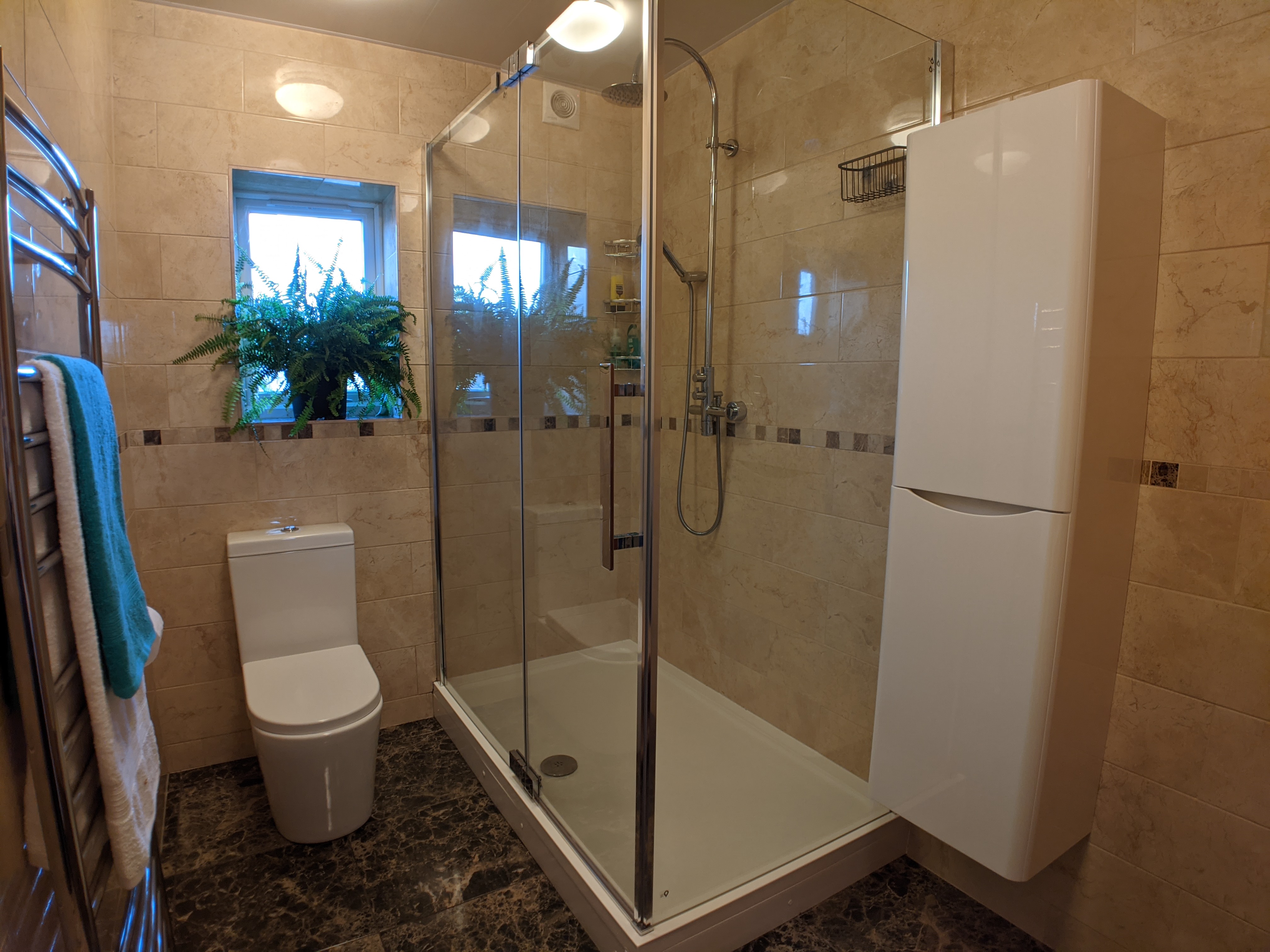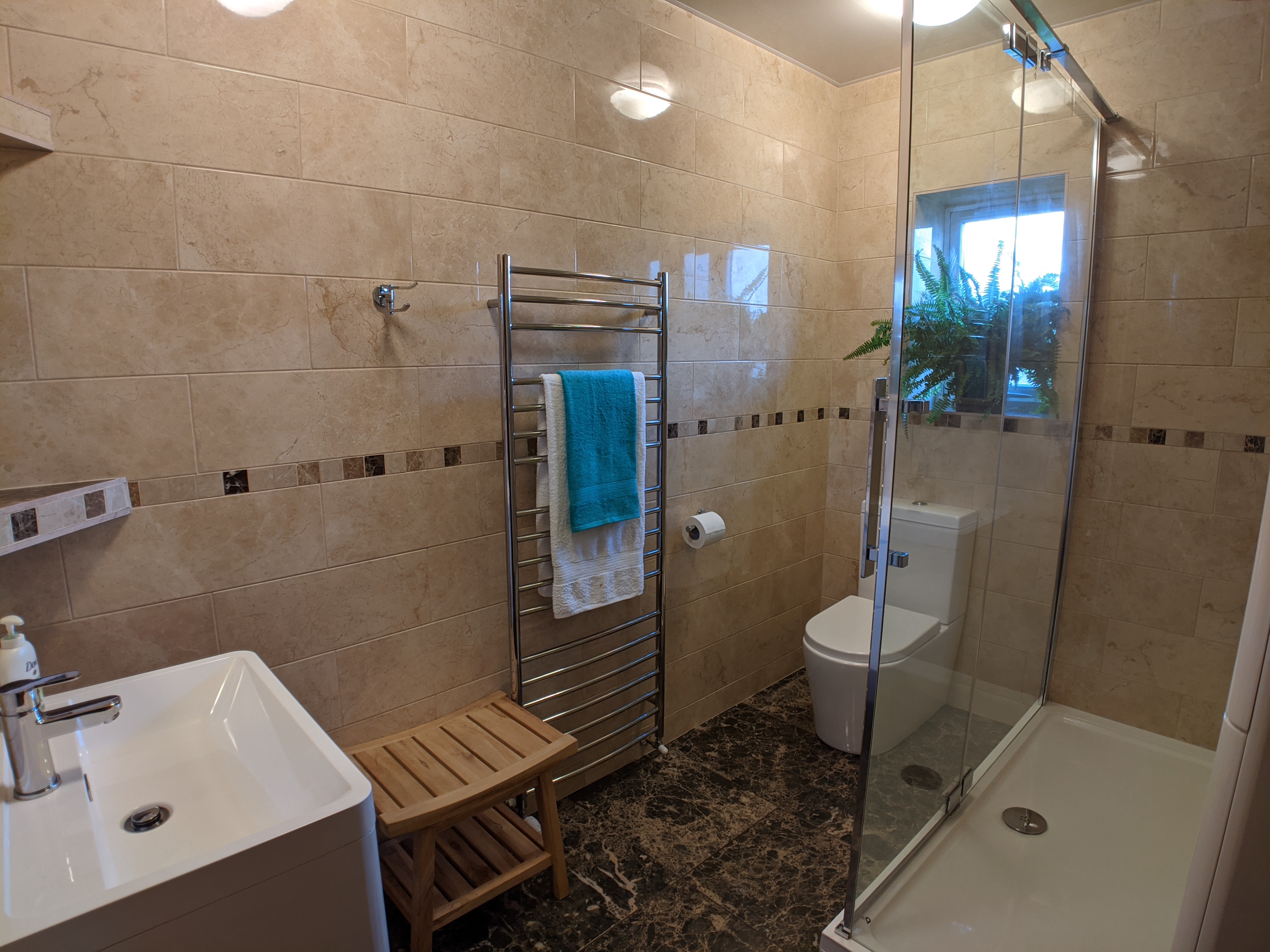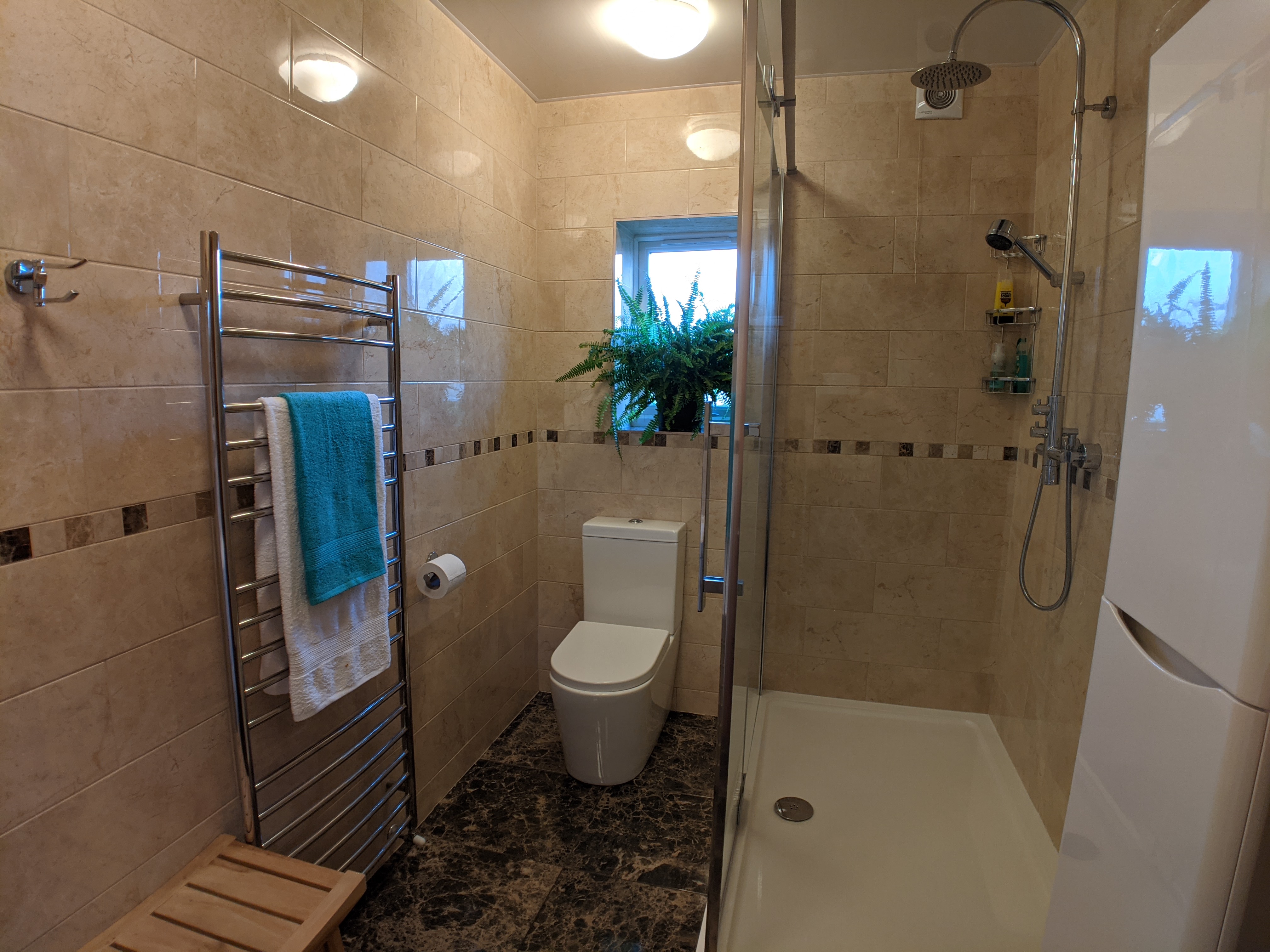 The bathroom has been stripped to the brickwork and completely rebuilt to be fully waterproof. The shower cabin is a very generous 150cm x 90cm.