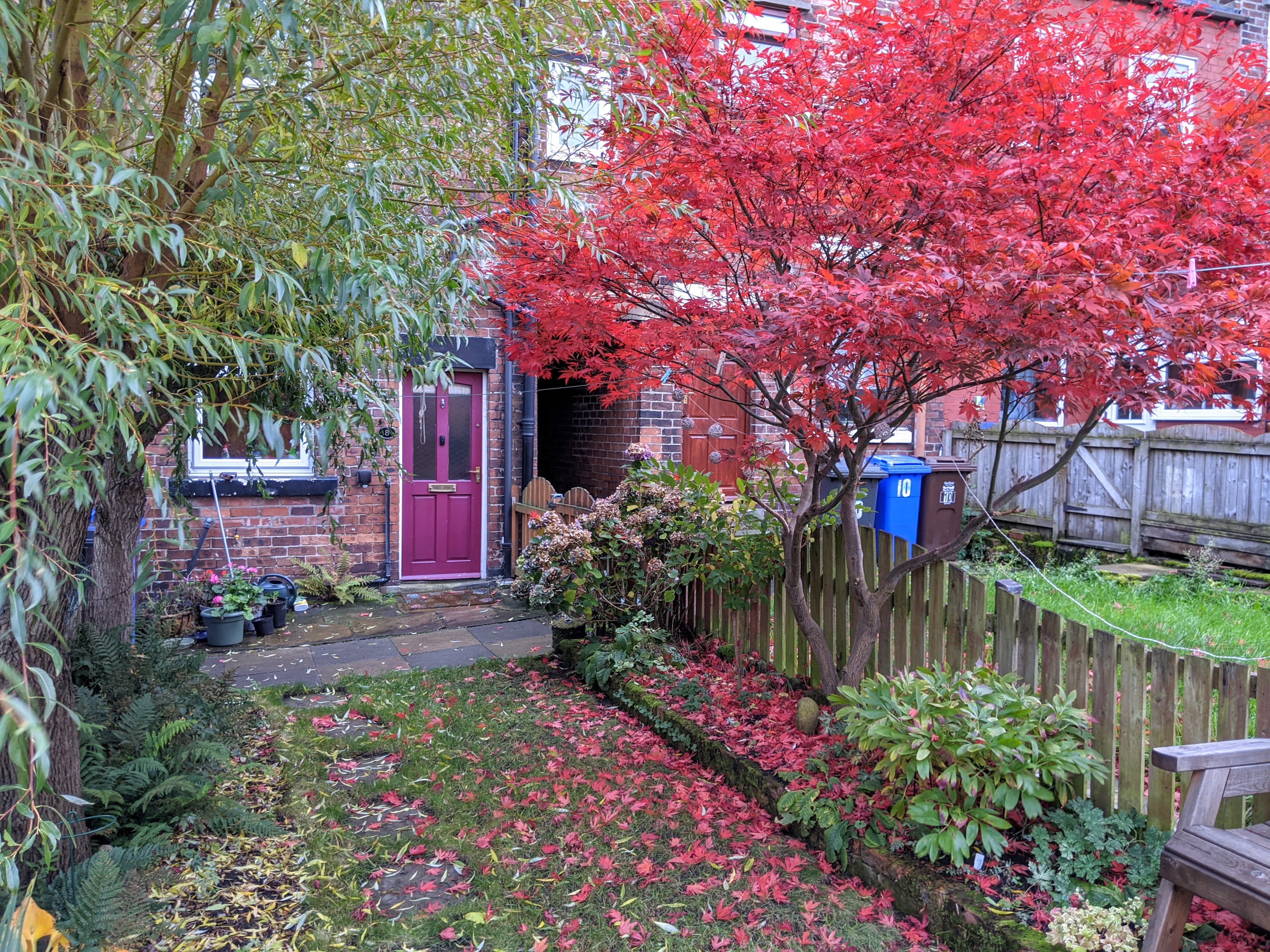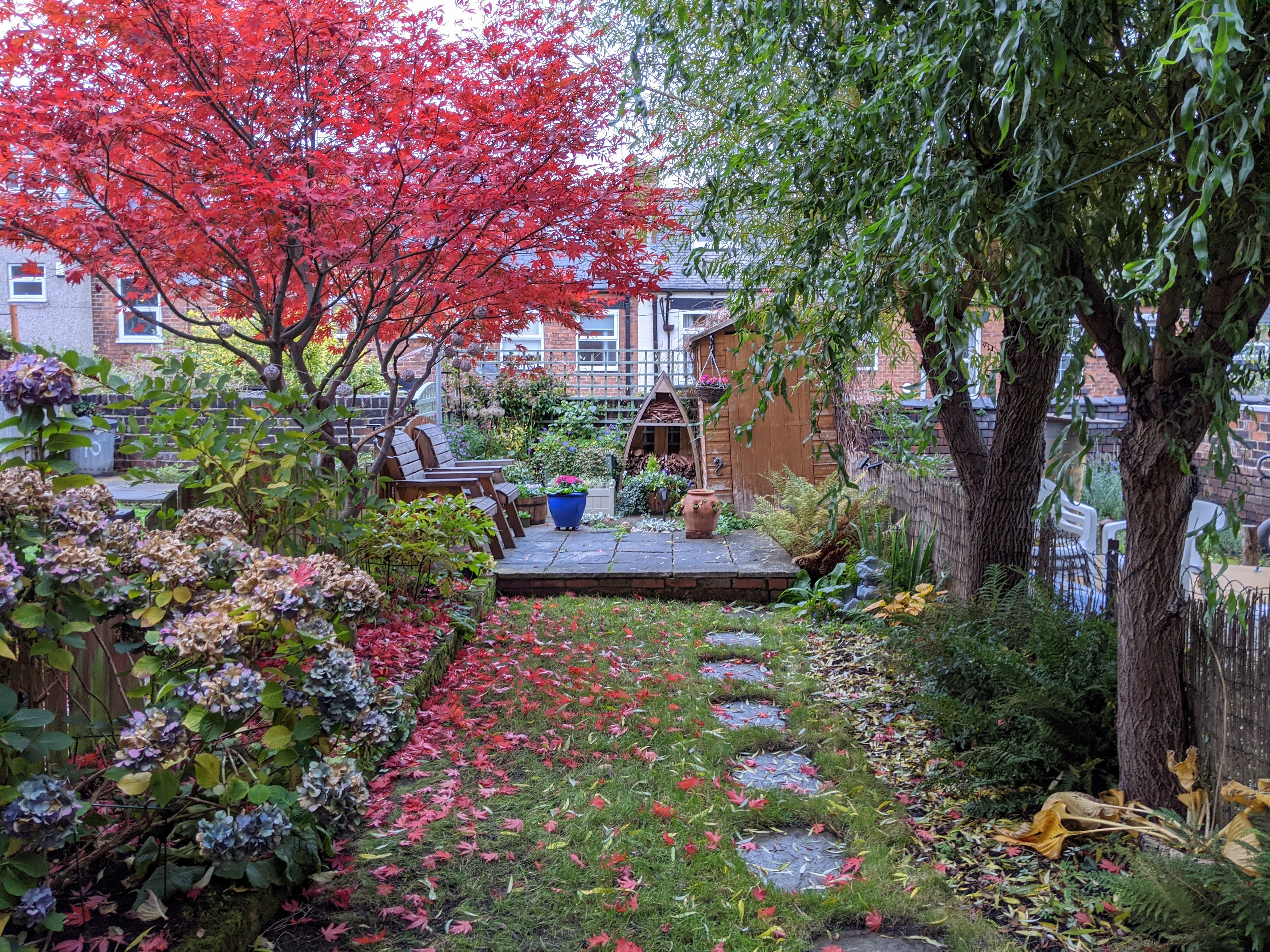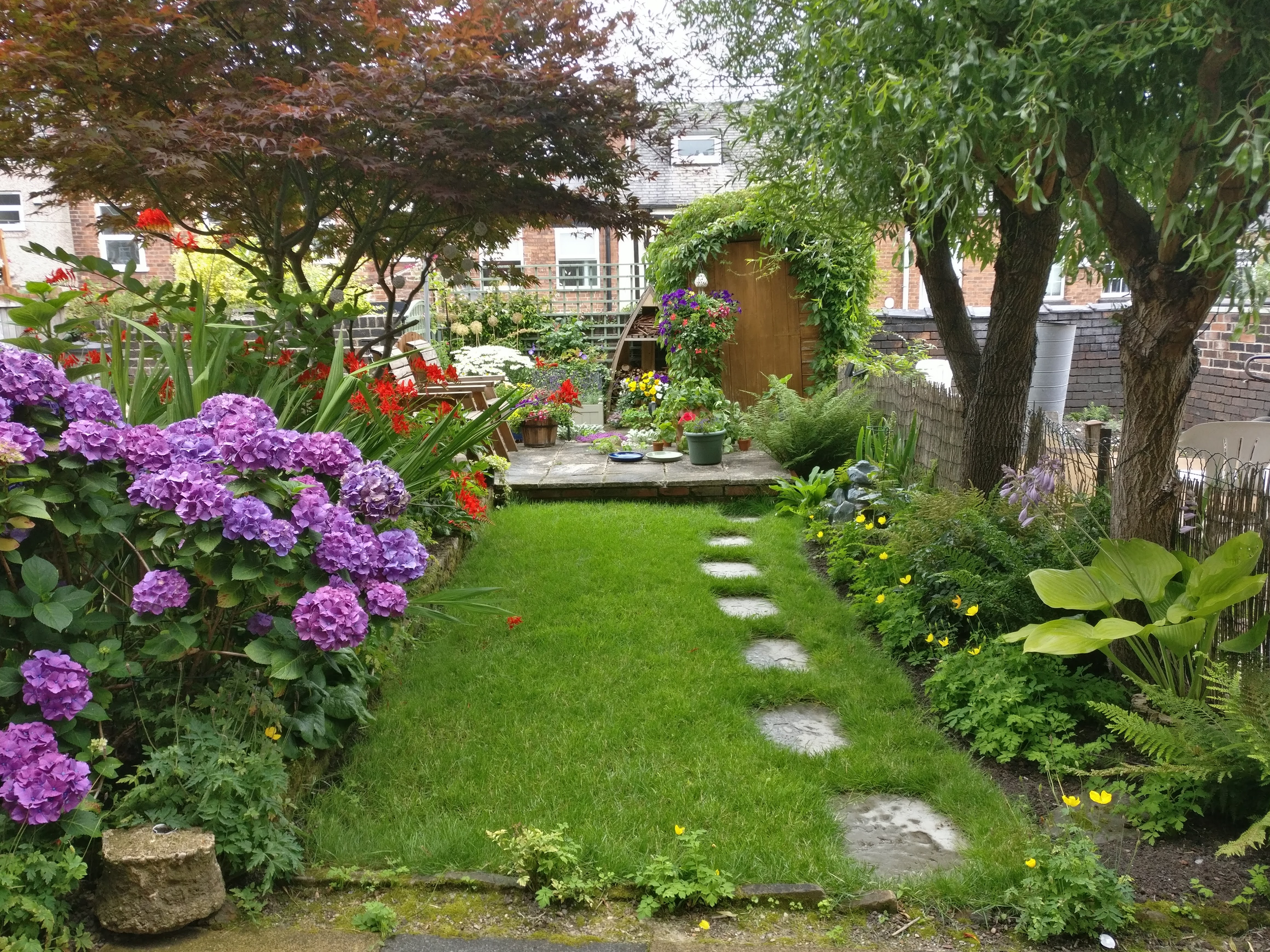 Outside Passage way to side of property leads to a paved hard-standing area and garden with lawn, flower-beds, two mature trees and raised paved area with shed.