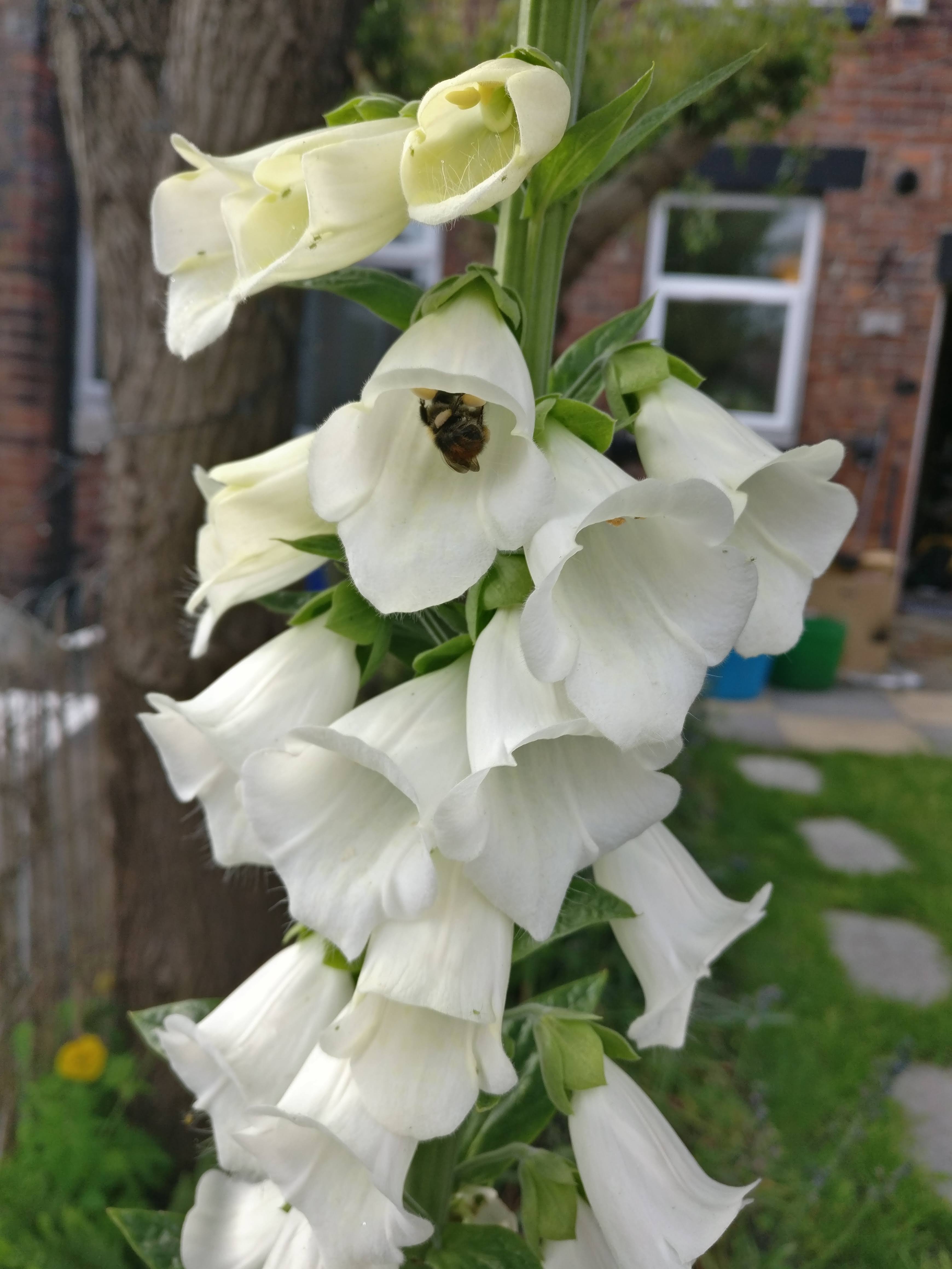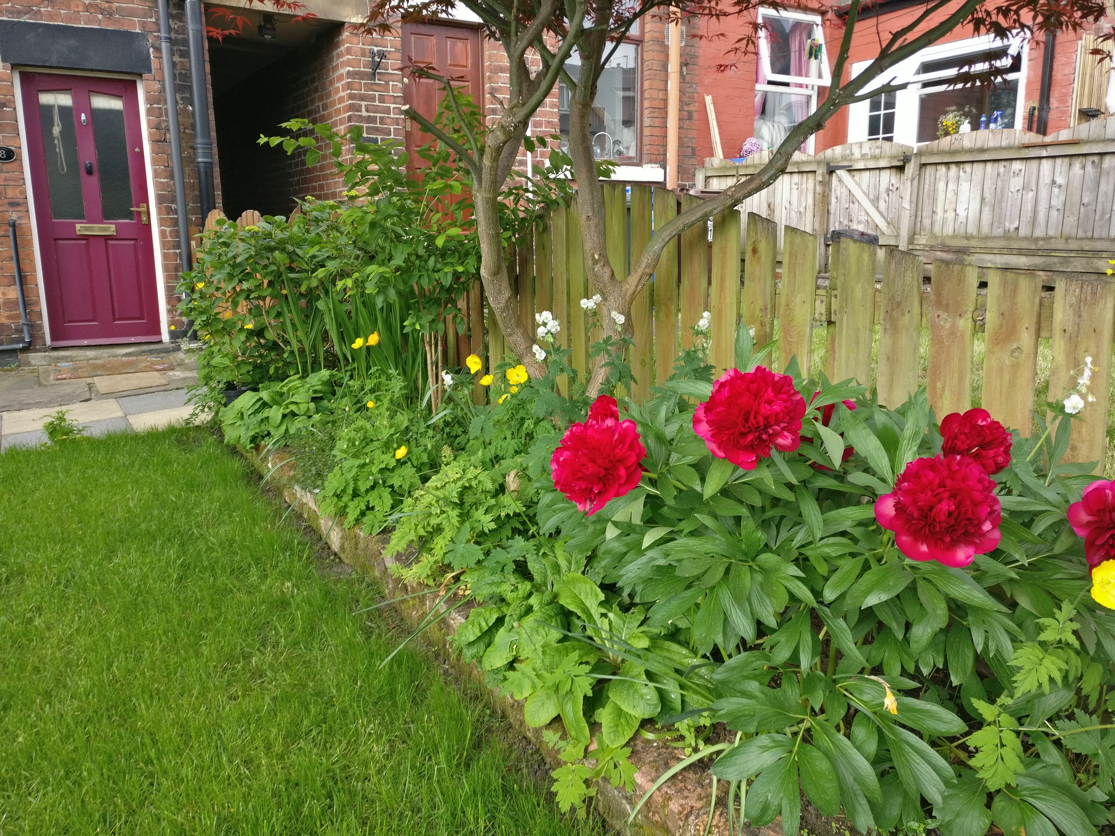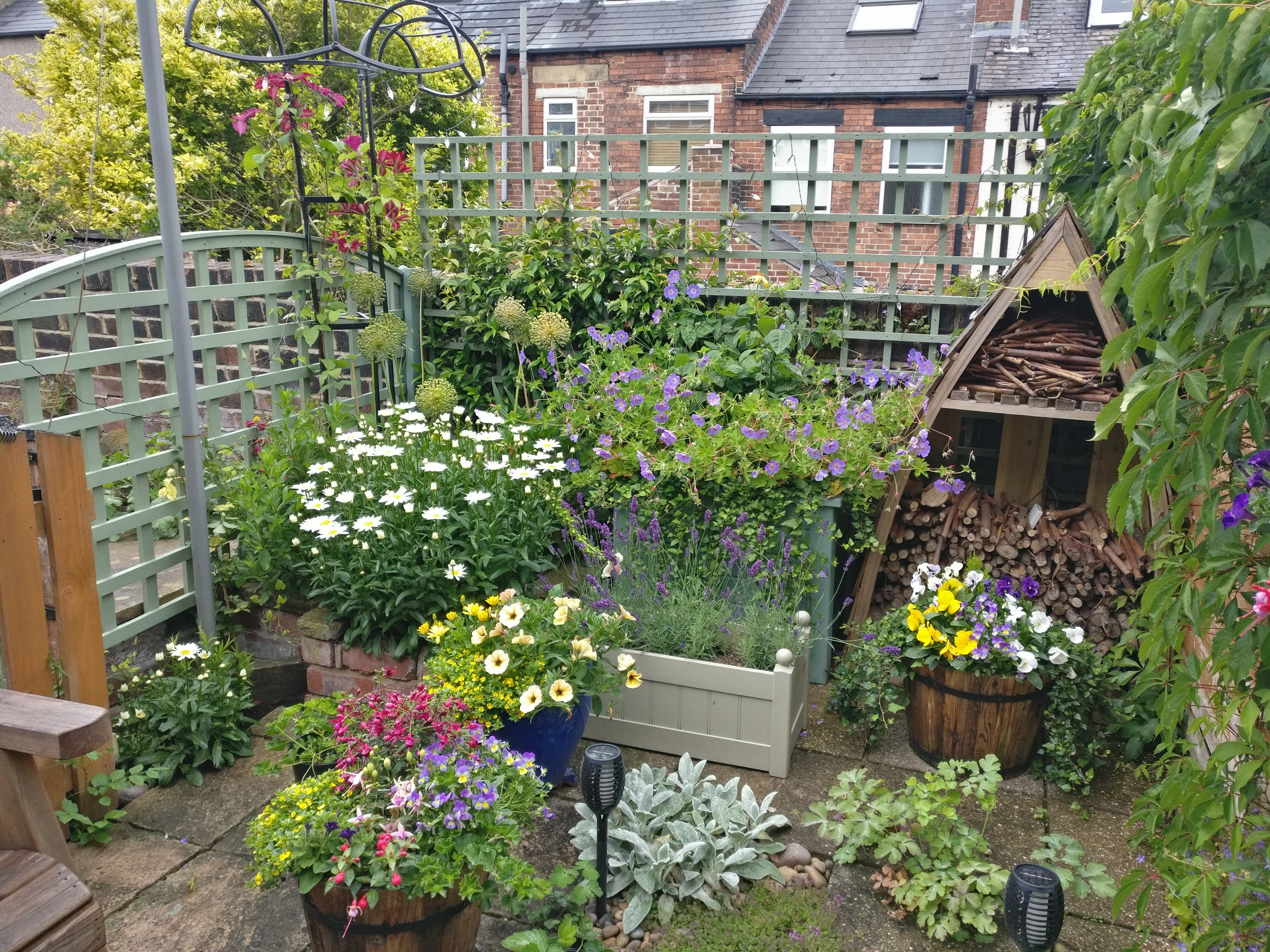Outside Passage way to side of property leads to a paved hard-standing area and garden with lawn, flower-beds, two mature trees and raised paved area with shed.